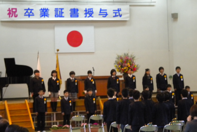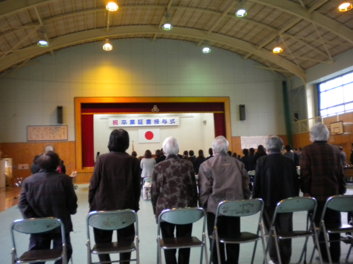 3月16日(金)秋月小学校卒業式でした。秋月小学校4年生とデイサービスセンターのんびり村の利用者さん(おじいちゃん、おばあちゃん)は、 何年も前から年2回交流会を開催しています。2年前に交流会ではじめて、指定介護老人福祉施設 甘木愛光園に来た子供たちが 大きくなって今日は小学校卒業です。秋月小学校の校長先生をはじめとする先生方の配慮で卒業式に立ち会わせていただきました。 中学生になろうとする成長した子供たちの姿を見せていただき、みんなより元気になられたようでした。