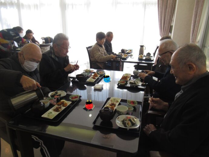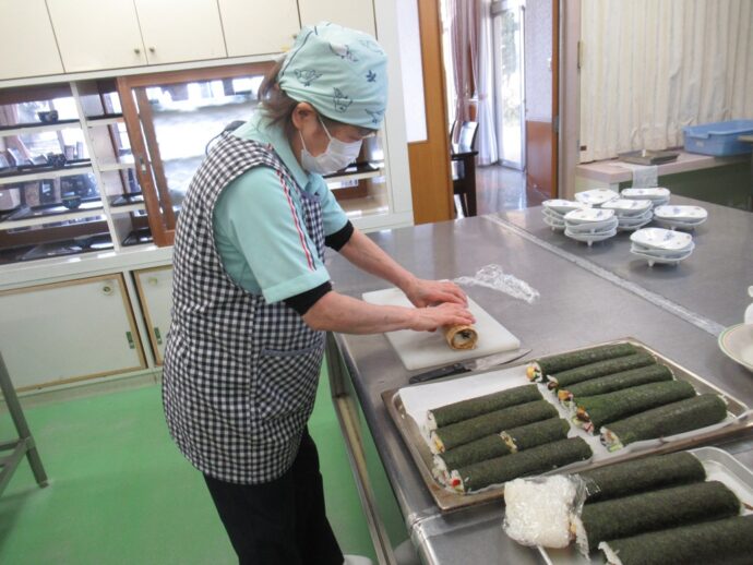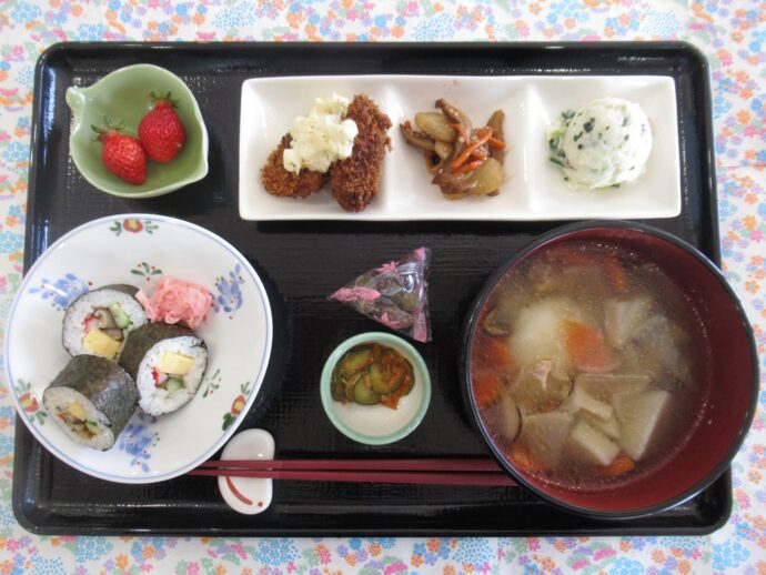 節分の日に縁起の良い食べ物、巻き寿司、けんちん汁を食べて頂きました😄