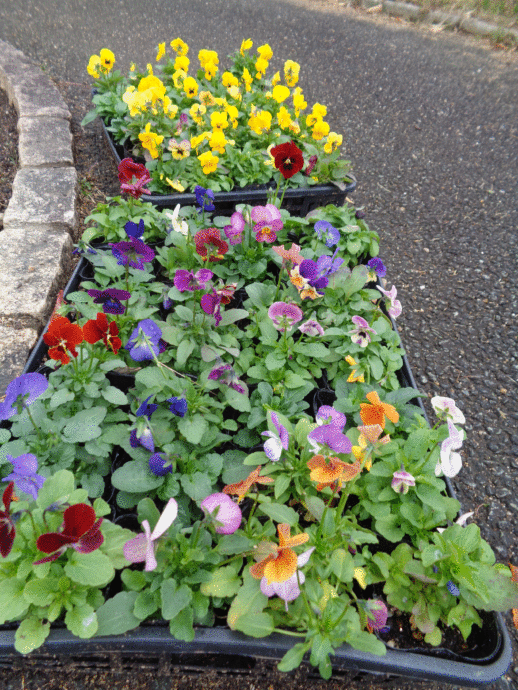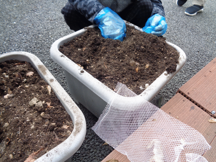 花壇にはビオラの苗。プランターにはスイセンの球根を植えました。
