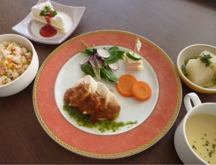 12月、世の中は大みそかに向かい、慌ただしく時間が過ぎています。しかし、梨ノ木城は変わらずゆったりとした雰囲気の中、皆さま、ご自身のペースで楽しい時間を過ごされています。そのような日常に12月のなしのき膳が提供されました。担当は厨房の稲舛さんです。ハムとチーズのピンチョス、やわらかいチキンにはグリーンのバジルソースがよく合います。少し早いクリスマスですね🎄