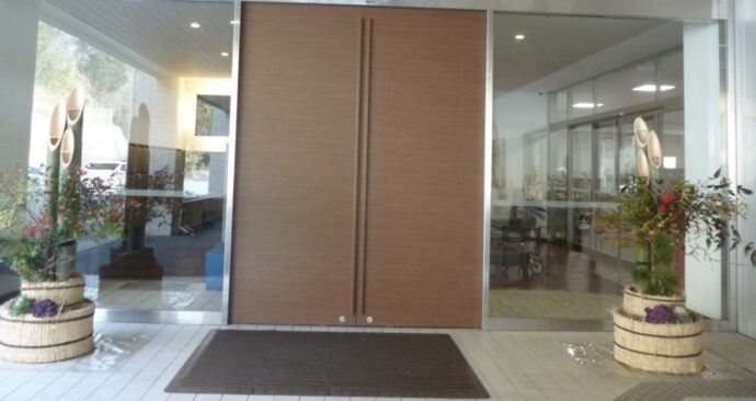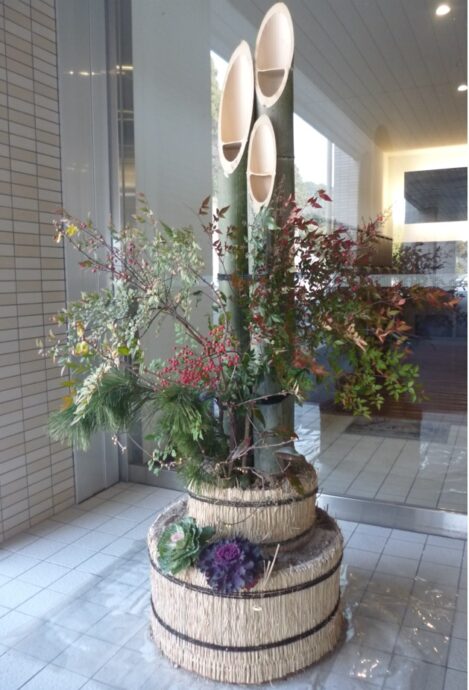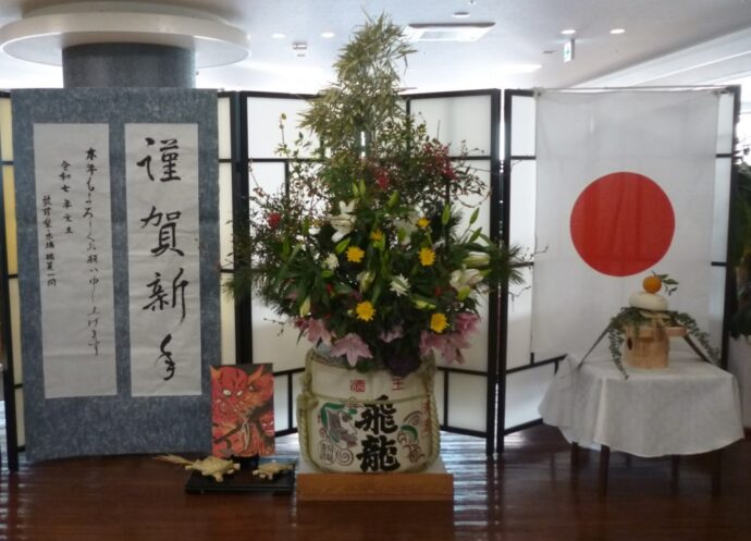 2025年!今年もどどーんと立派な門松、豪華絢爛な生け花や正月の書など入口に飾りました。花は入居者様が見守る中、事務職員の在津さんがダイナミック且つ繊細に生けてくれました。見事!!