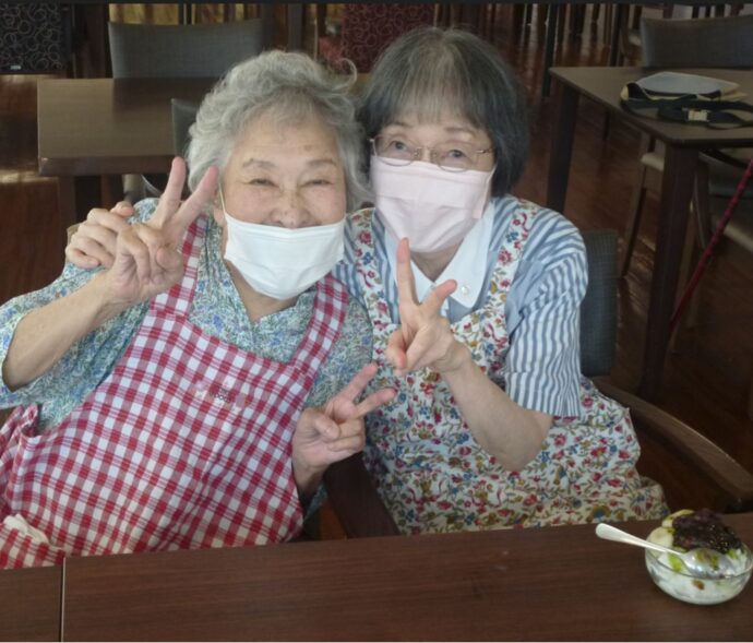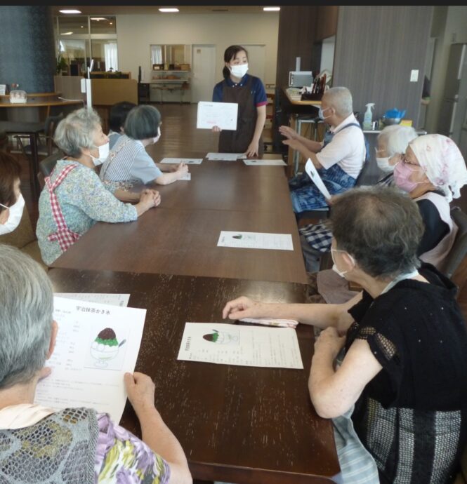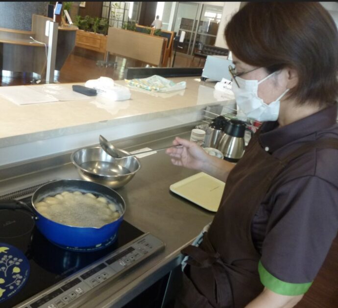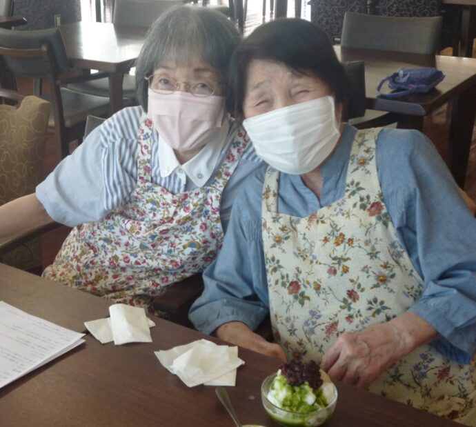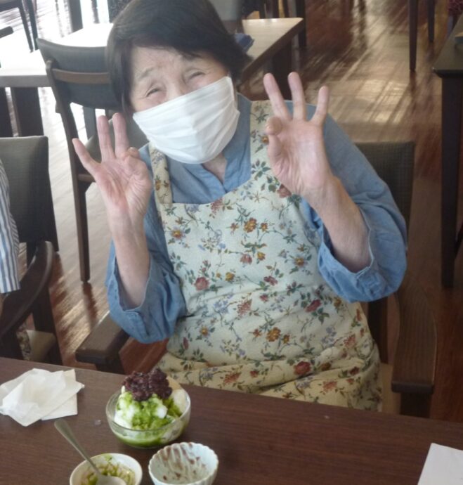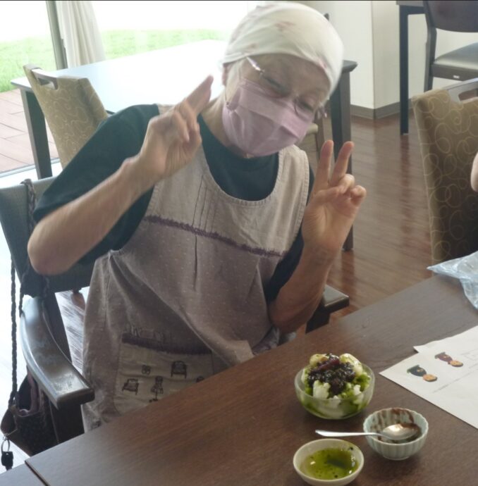 豆腐入りの白玉団子、ミルクかき氷、宇治抹茶の蜜にあんこ、絶対に美味しいはず!参加された入居者様も楽しそうに団子をこねこね、氷をもみもみ、あんこを乗せ乗せ(笑)会話も弾みます。団子は厨房職員の稲舛さんがキッチンでゆでてくれました。まなざしが真剣です!集中!!!