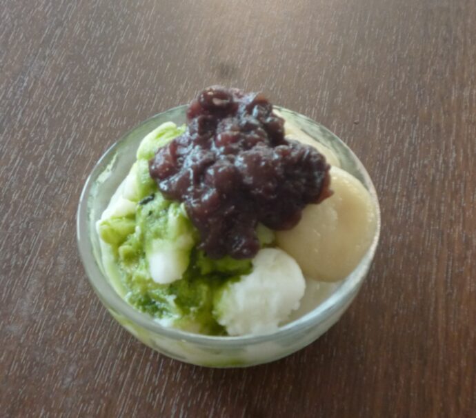 8月31日、台風一過で日差しはギラギラ。今日はおやつ教室の日です。メニューは「宇治抹茶かき氷」さあ!出来上がりを見て下さい!