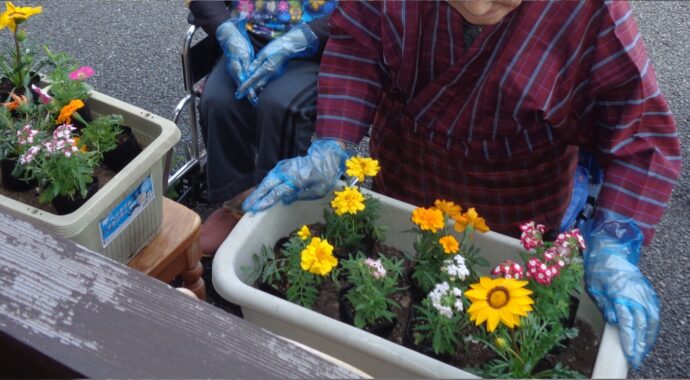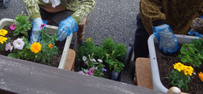 花の苗を一つ一つ丁寧に土に植えていきます。 これから水やりをして、雑草を取り、見ごろになったら花壇のお花見をする予定です。