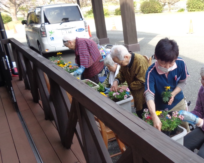 4月の晴れた日、愛らんどのデッキ前に花壇つくりを行いました。