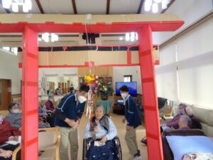 まずは新年の挨拶、手作りの鳥居に参拝してお屠蘇をみんなで頂きまして、