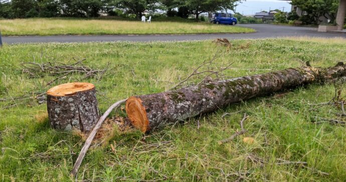 一部枯れていて🌀台風などで折れると☢危険なので早めにと梨ノ木城施設長や環境面をして下さる方が☔梅雨前の🌞暑い日に切り倒してくれたのです。