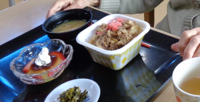 グループホーム愛らんどでは、いつも手作りの🍴食事を提供していますが今日は🏡お店から購入した美味しい🍚牛丼をメインに具だくさん味噌汁とお漬物、🍓苺デザートを添えて食事を楽しんで頂きました。
