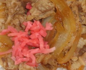 今日の登場食:牛丼/漬物/味噌汁/苺デザート ↓