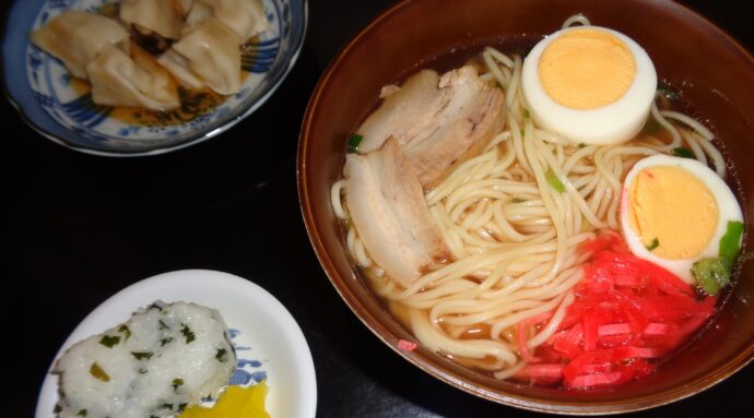 昼食時には🍜ラーメンに餃子とおにぎりがつきました