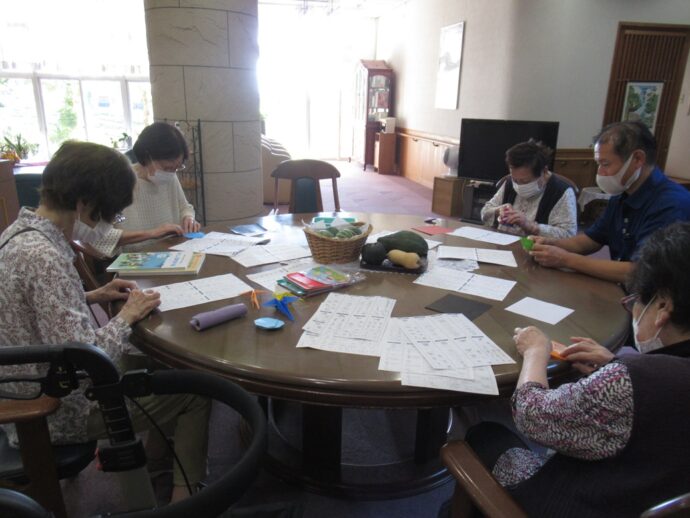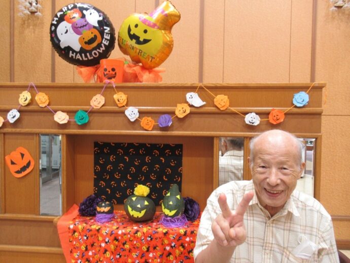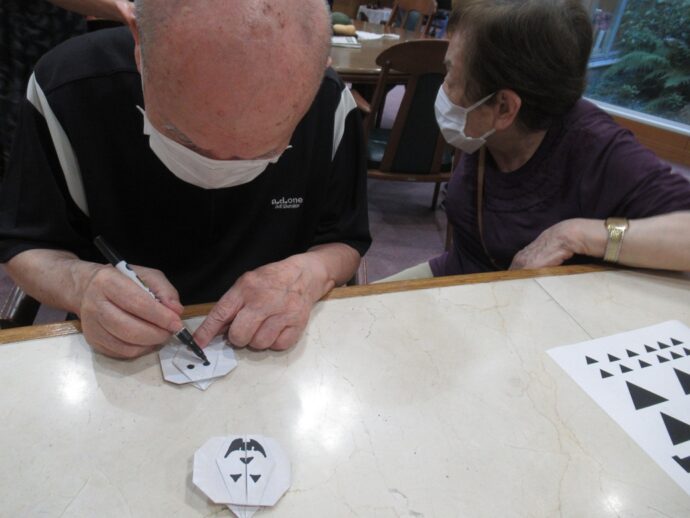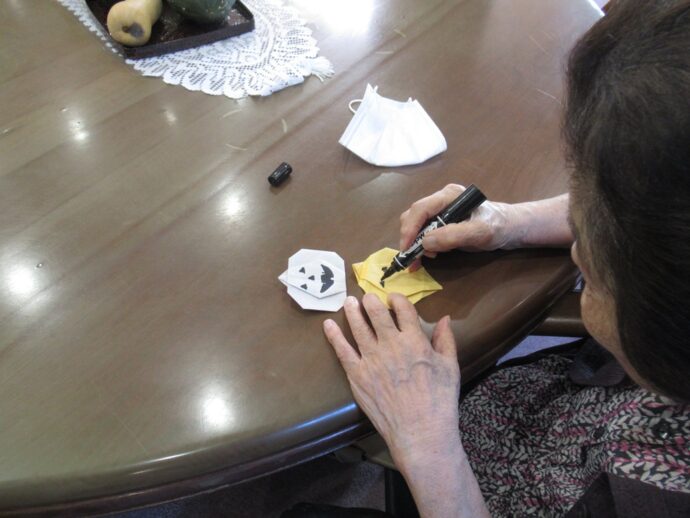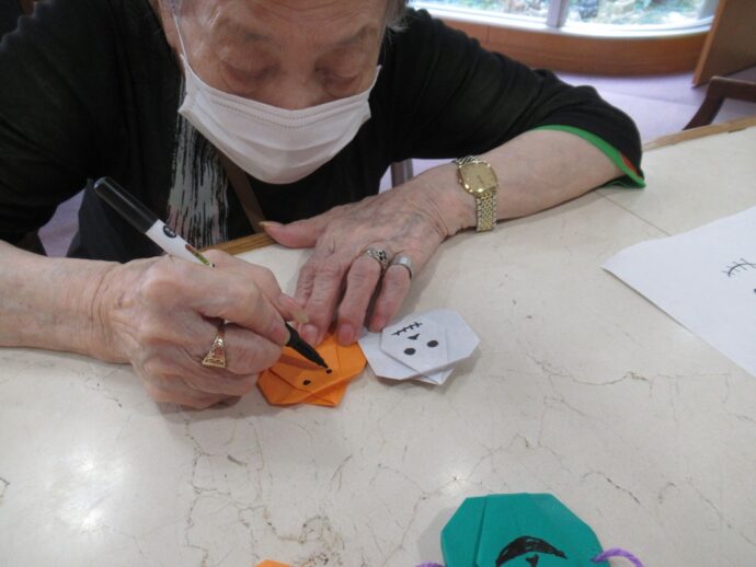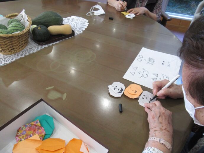 ご入居者様にかぼちゃの折り紙や文化祭に向けての折り紙を折って頂き、かぼちゃの折り紙にはそれぞれ好きな顔を書いて頂きました。