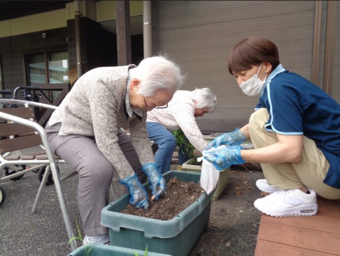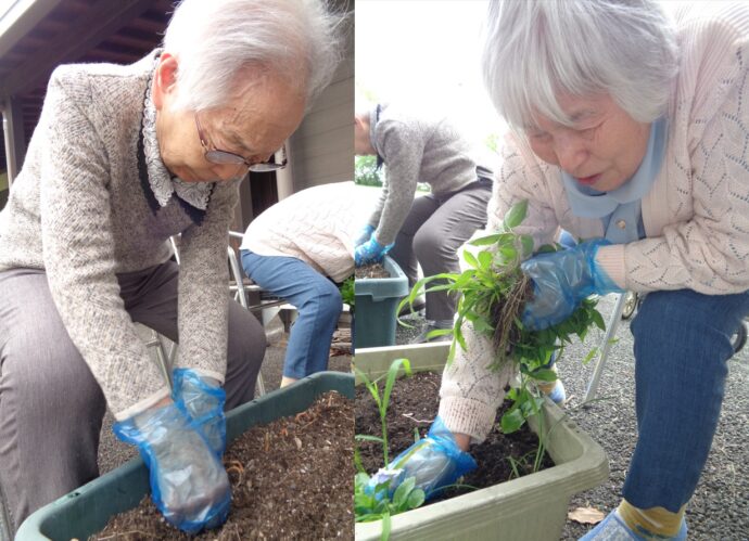 今日は 植物の苗植えを職員見守りの上で2人の利用者の方に して頂きました。鉢植えの中の草取りもしましたよ!