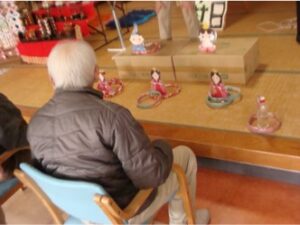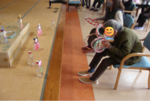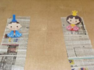 お雛様わなげ 納得がいかず何度もチャレンジされる利用者もいました😆 お雛様とお内裏様を新聞紙を長くつなげた先端に乗せ足で手繰り寄せ、競い合いました。足を動かすのに夢中になりお雛様を置いてきぼりにされる方も😅 同じ色を付けた紙コップに重ねるゲームです。みなさん一生懸命足を動かし、がんばっていました👍