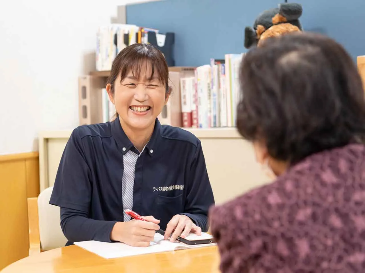 そのケアマネージャーの部署がラ・パス供託介護支援 事業所。皆様のご要望をうかがい、最適なプランをご提案し、各事業所との調整を行いま す。
